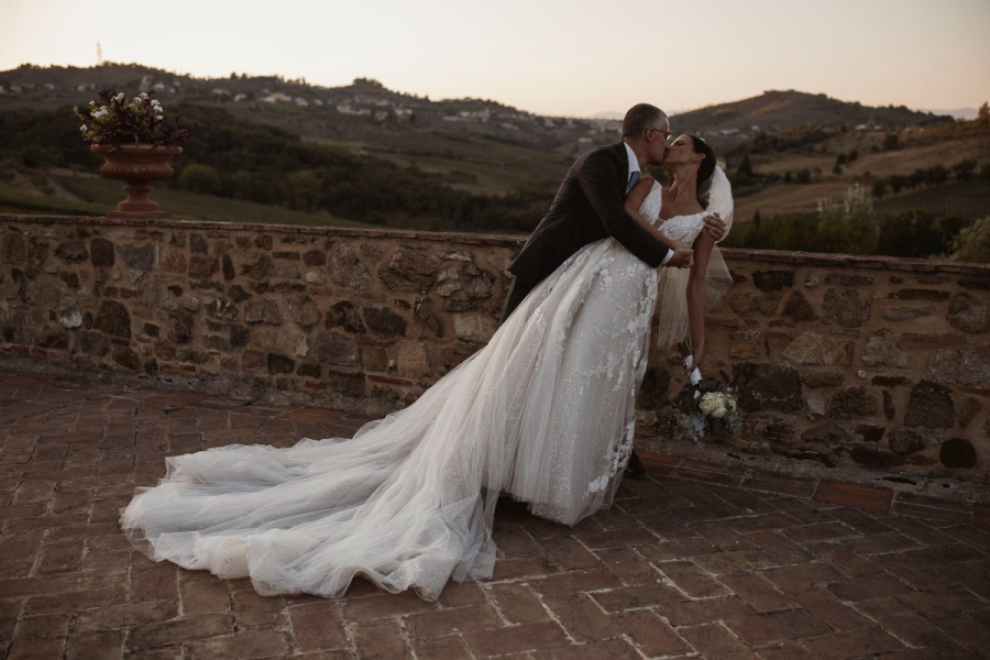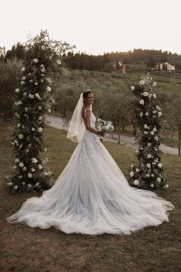 Krásná slečna Eliška v modelu Pronovias Privée SAI v Toskánsku.