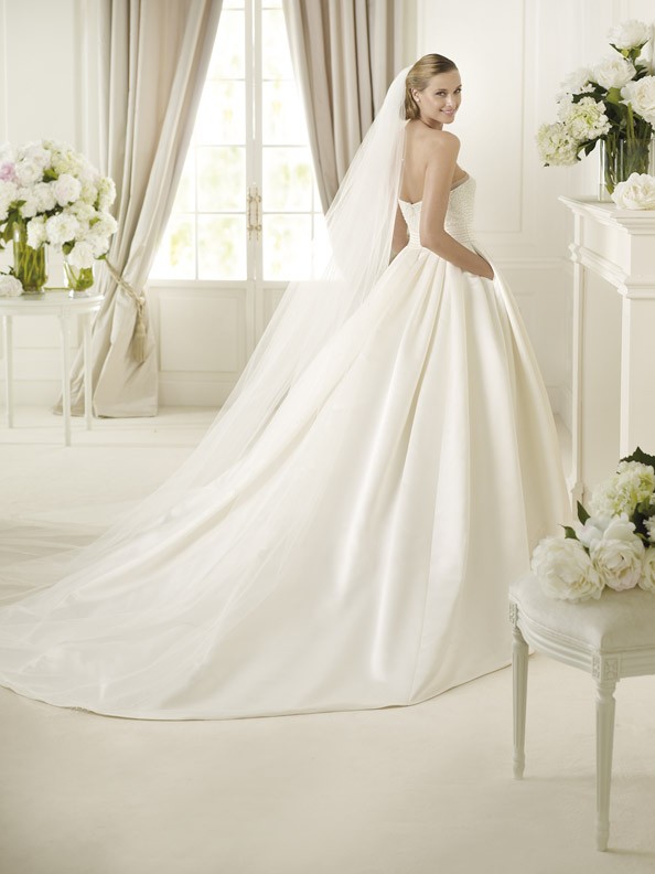 Svatební šaty z NUANCE, svatební model Dalamo od Pronovias. Svatební šaty Pronovias 2014 začnou z Barcelony do NUANCE chodit postupně. První nové modely budou pouze ke koupi, od srpna 2013. Do konce letošního roku bude ve svatebních salonech NUANCE opět výrazně největší množství svatebních šatů Pronovias 2014 v České republice. Zobrazený model odráží styl nové svatební sezóny. Na konkrétní nabídku modelů 2014 je třeba se informovat přímo v salonech NUANCE.